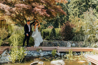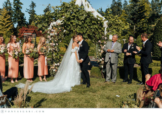 Set amidst the meticulously manicured grounds of Froggsong Gardens on Vashon Island, Emily and Cleve gathered with their loved ones for this delightful outdoor wedding. The dusty sunset tones and seasonal florals paralleled the warmth and authenticity of their joyful, mid-summer celebration.