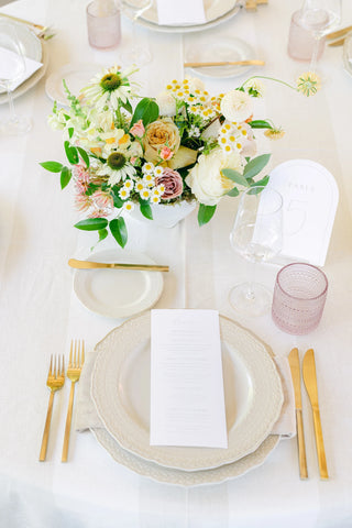 On the table, thoughtfully coordinated design elements popped against the white table cloth. The gold flatware and elegant pink glassware were excellent choices that paired perfectly with summery centerpieces.