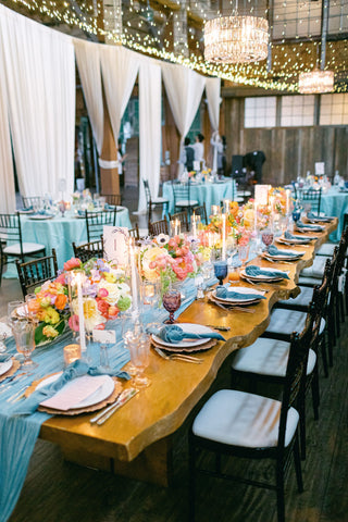 Lauren and Mark said their heartfelt vows in ceremony under twinkle lights and crystal chandeliers. They kept their ceremony decor simple and went big for the reception. The vibrant colors popped against the natural wood of historic Sodo Park. Soft blues, bright pink and apricot floral arrangements adorned the live edge tables. Throughout the venue guest enjoyed stunning statement pieces that brought this Italian love story to life.