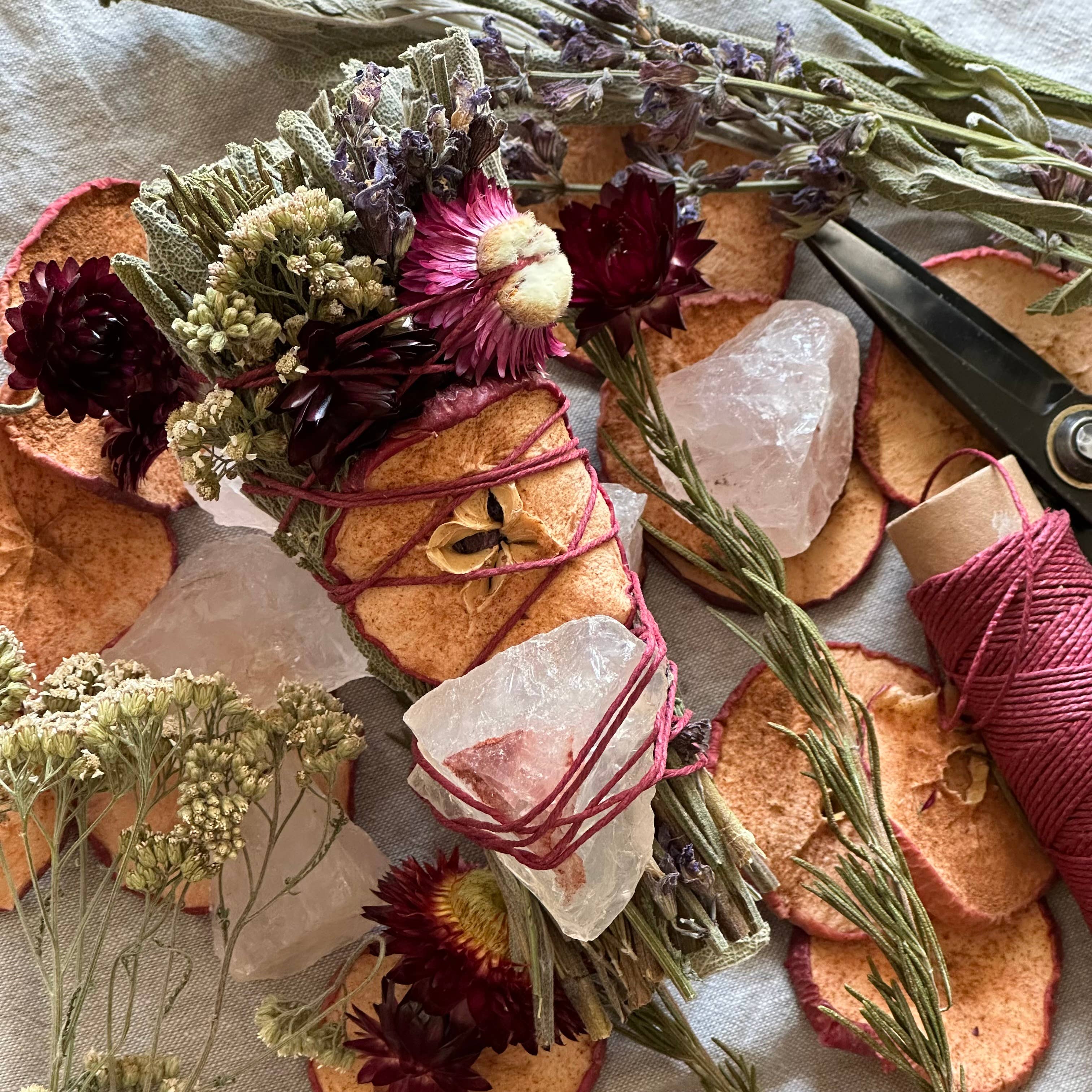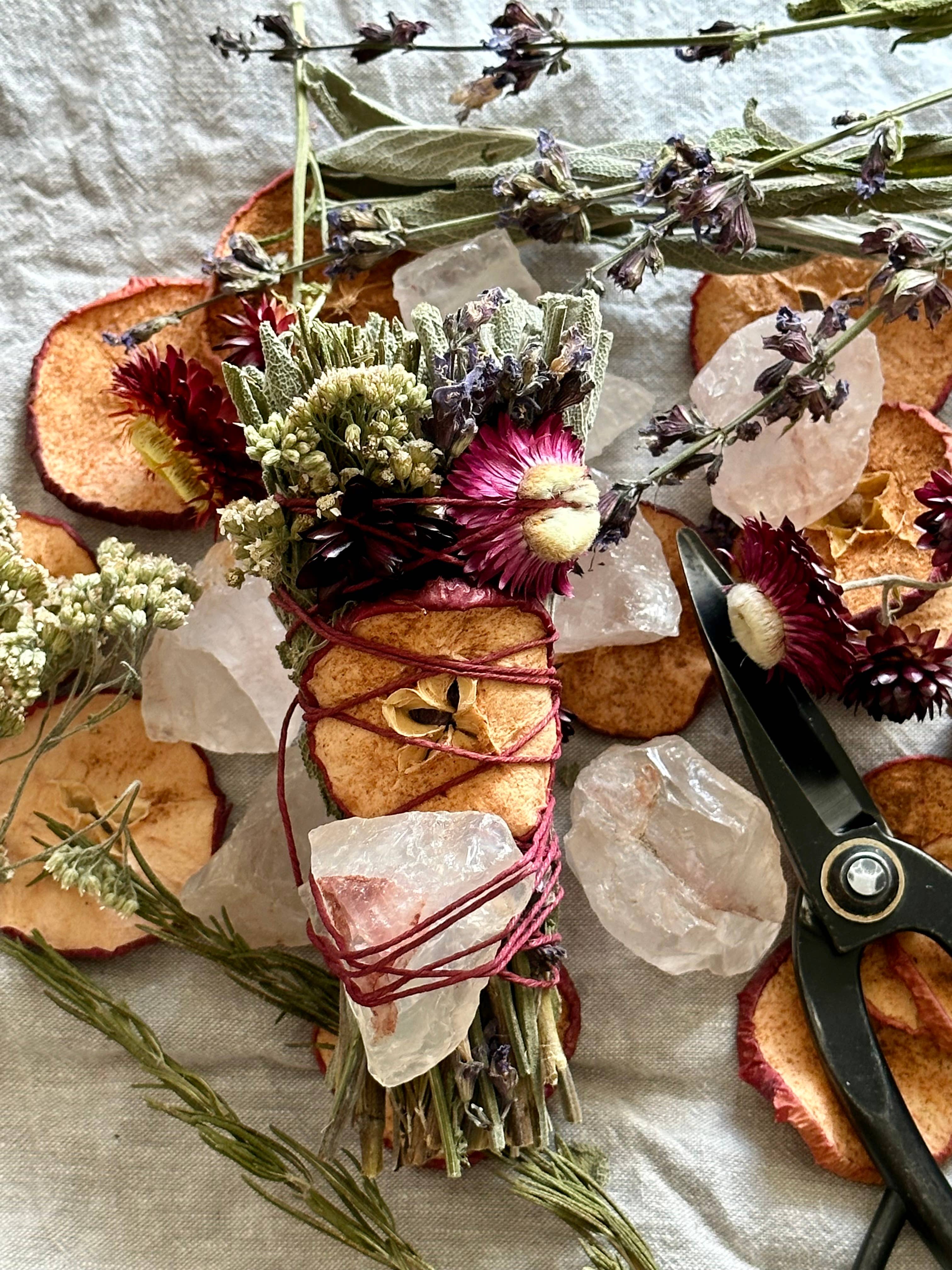 Garden Sage, Mugwort, Rosemary, Mountain Mint, Cinnamon Apple, Strawflower, Fire Quartz.